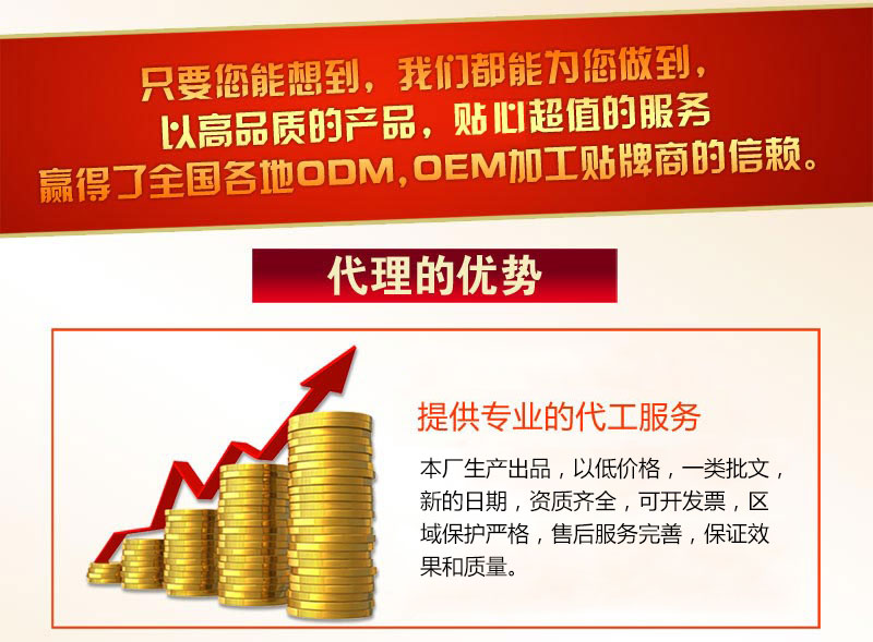 我们提供专门的代工服务,承接各种来料加工,贴牌加工,保姆式一站服务,提供商标文号的使用,包装素材的设计等等,我公司从事医药行业多年,积累了丰富的生产技术相关经验,具有河南省一类医疗器械文号。河南省用品文号,贵州的分公司也审批了一类医疗器械文号。
